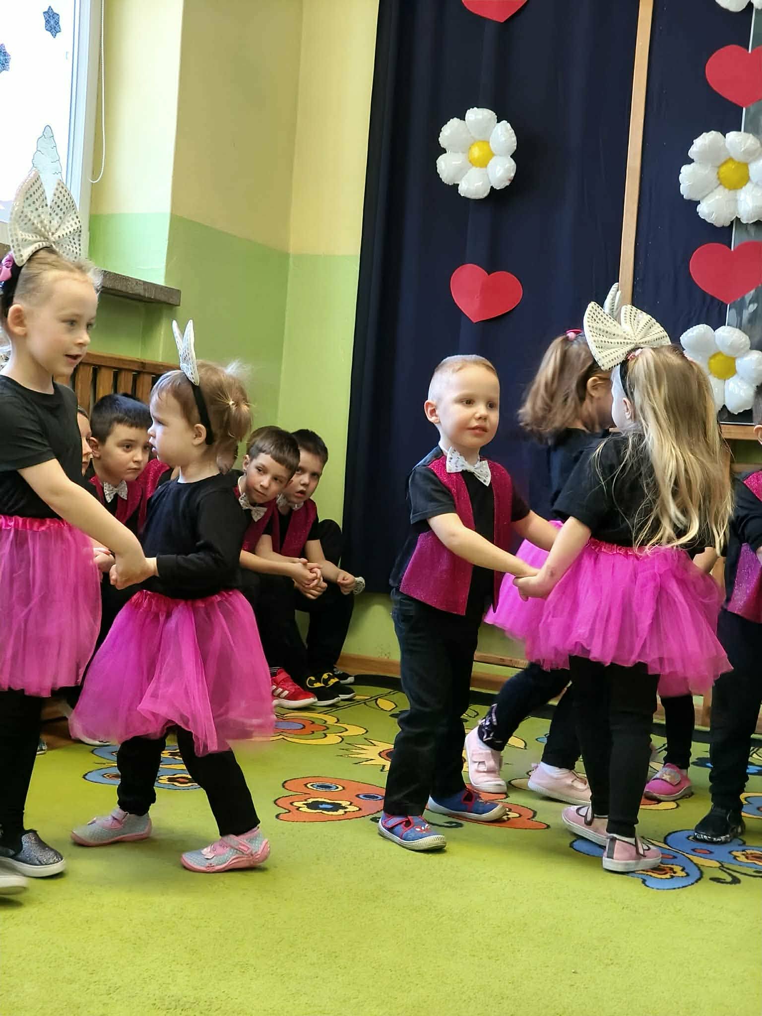 Dziewczynki przedstawiły taniec z kolorowymi chustami, przy wzruszającej piosence. Z kolei chłopcy zaprezentowali grę na instrumentach muzycznych, wprowadzając radosny i rytmiczny nastrój.