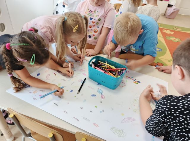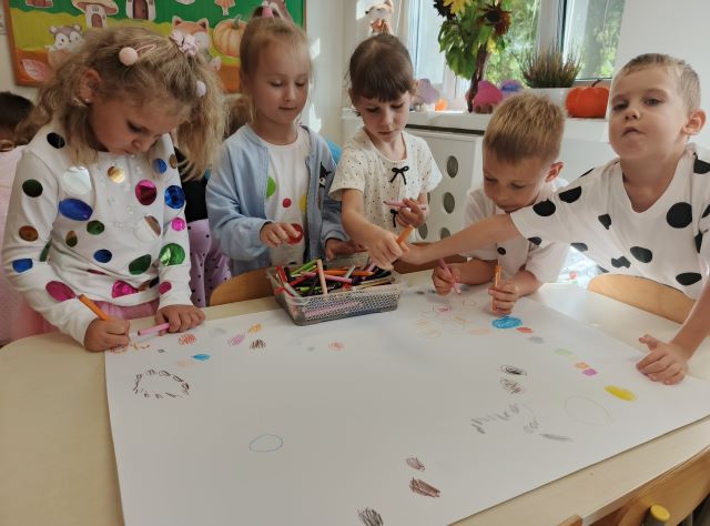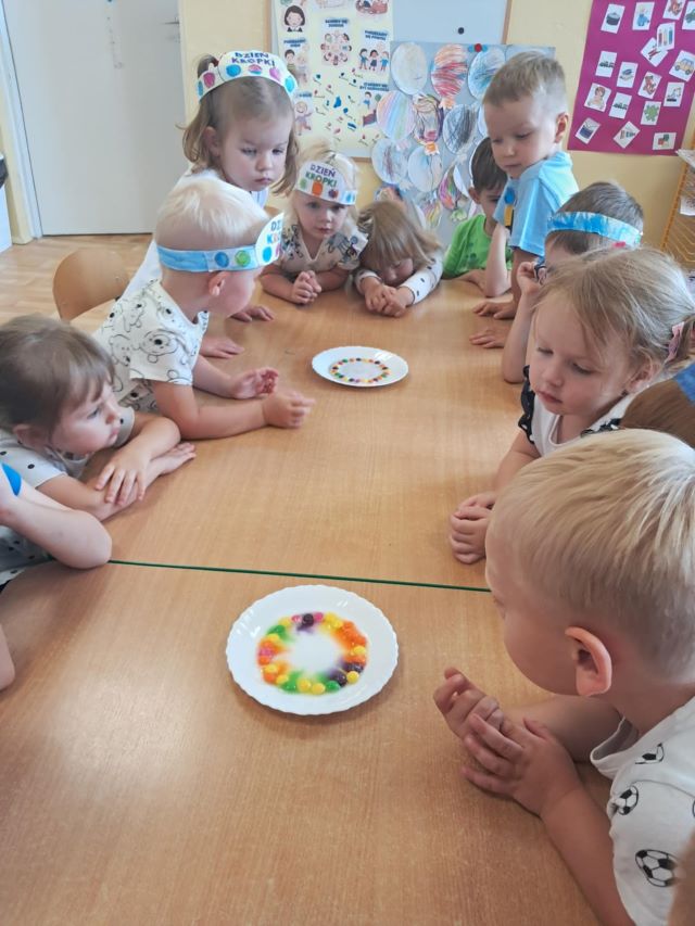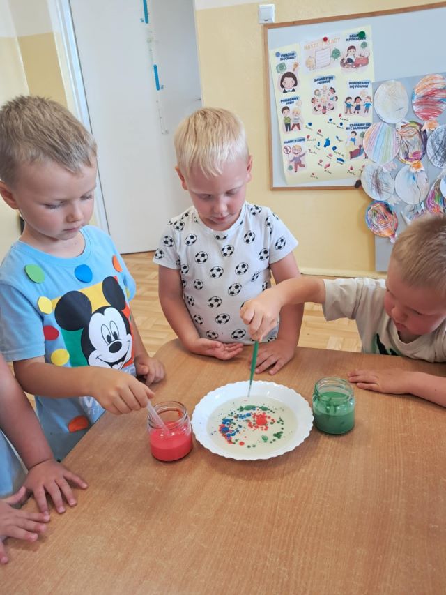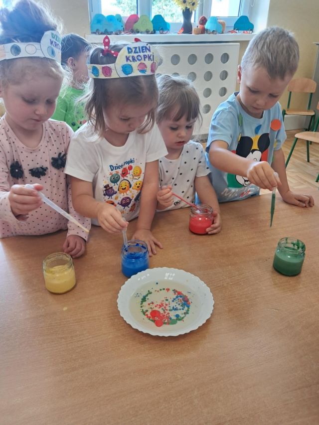 Następnie przedszkolaki uczestniczyły w różnorodnych zabawach ruchowych i plastycznych, które rozwijały ich kreatywność i pomysłowość. Malowały, wyklejały i tworzyły własne prace inspirowane motywem kropki – kolorowe obrazy, papierowe kompozycje i wspólne plakaty. Nie zabrakło też eksperymentów, które wzbudziły ogromne zainteresowanie i zachwyt dzieci – każdy chciał samodzielnie sprawdzić, jak „działają” kolorowe kropki w praktyce!