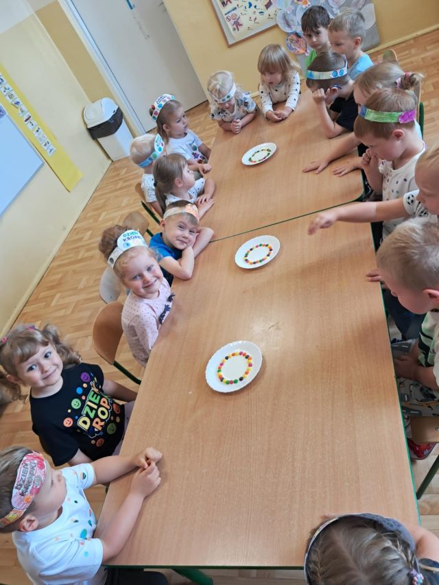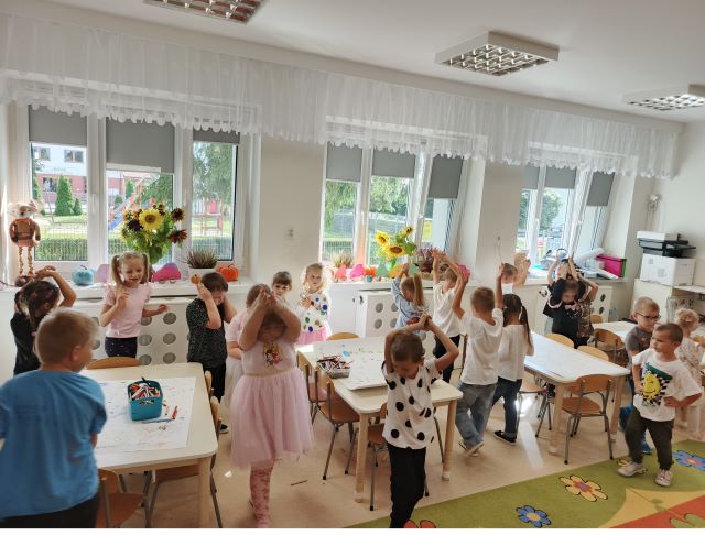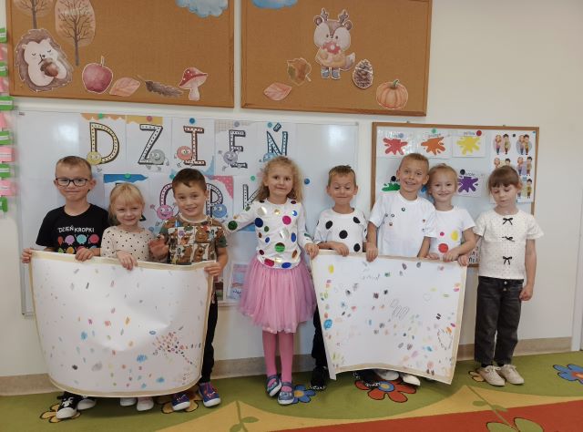 Już od rana w przedszkolu panowała wyjątkowa atmosfera – dzieci przyszły ubrane w stroje pełne kropek, uśmiechnięte i gotowe na wspólną zabawę. Dzień rozpoczął się od projekcji filmu edukacyjnego o Vashti, dziewczynce, która dzięki jednej małej kropce odkryła w sobie talent i wiarę w to, że każdy potrafi tworzyć coś wyjątkowego. Film był inspiracją do rozmów o tym, że „wszystko zaczyna się od kropki” i że każdy z nas ma w sobie coś wyjątkowego.