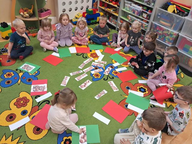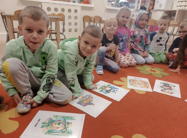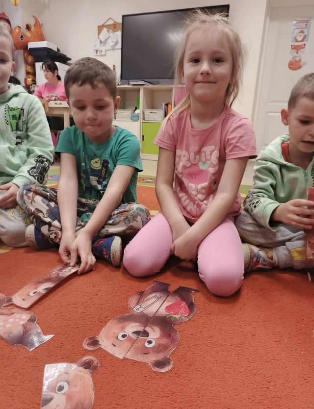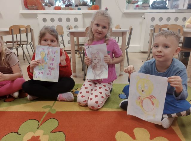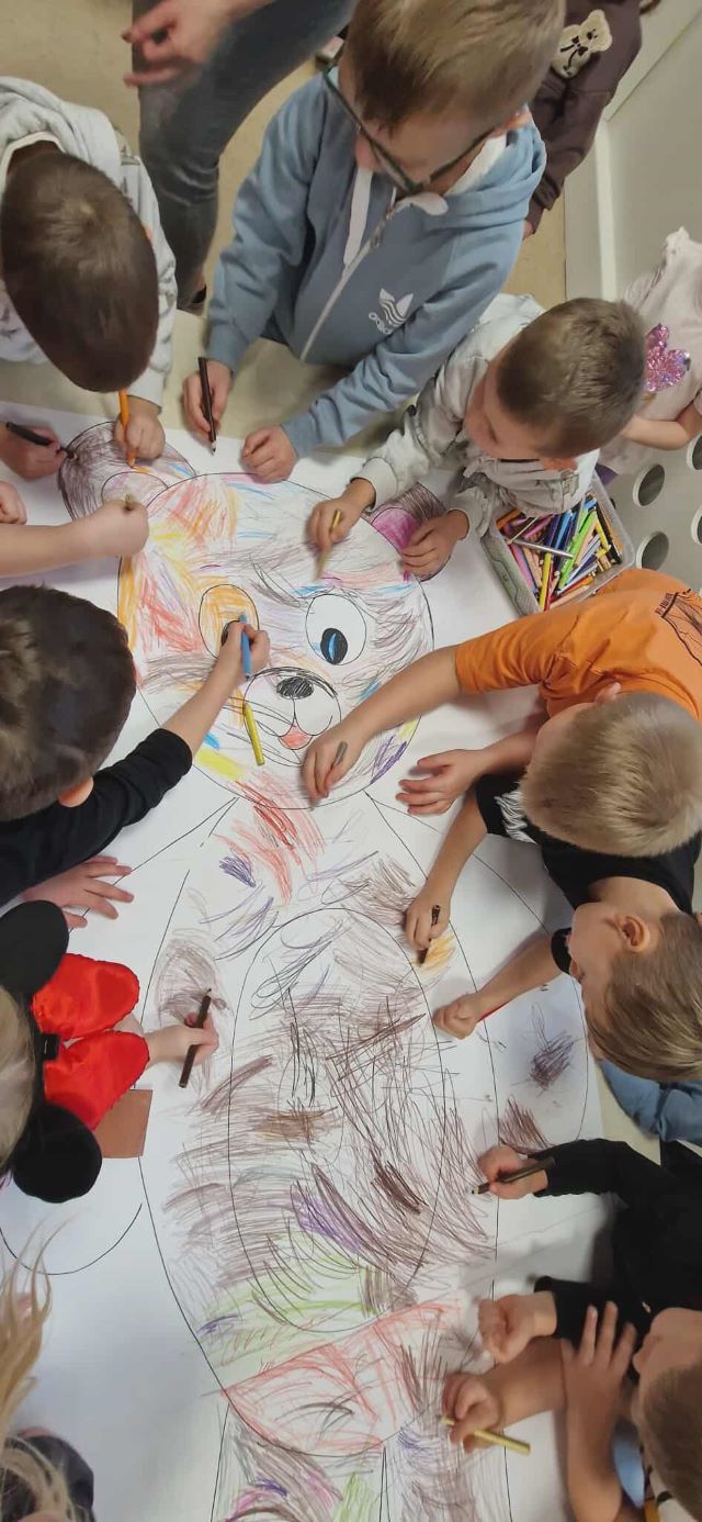 Dzieci miały również okazję pokazać swoją kreatywność. Malowały kredkami misia na kartonie, tworząc wspólne, kolorowe dzieło. Gotowy plakat zawisł w sali jako piękna dekoracja przypominająca o naszym misiowym święcie.