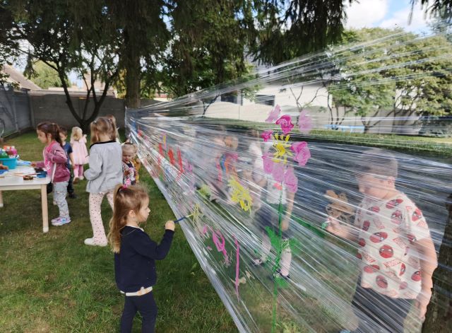 Po porannej porcji ruchu, przyszedł czas na kreatywne wyrażanie siebie. W przedszkolnym ogrodzie dzieci miały okazję malować na przezroczystej folii rozciągniętej między drzewami. Kolorowe farby, szeroki wachlarz pomysłów i wolność twórcza sprawiły, że powstały prawdziwe dzieła sztuki. Ta forma plastycznej aktywności dała dzieciom ogromną frajdę i możliwość rozwijania wyobraźni.