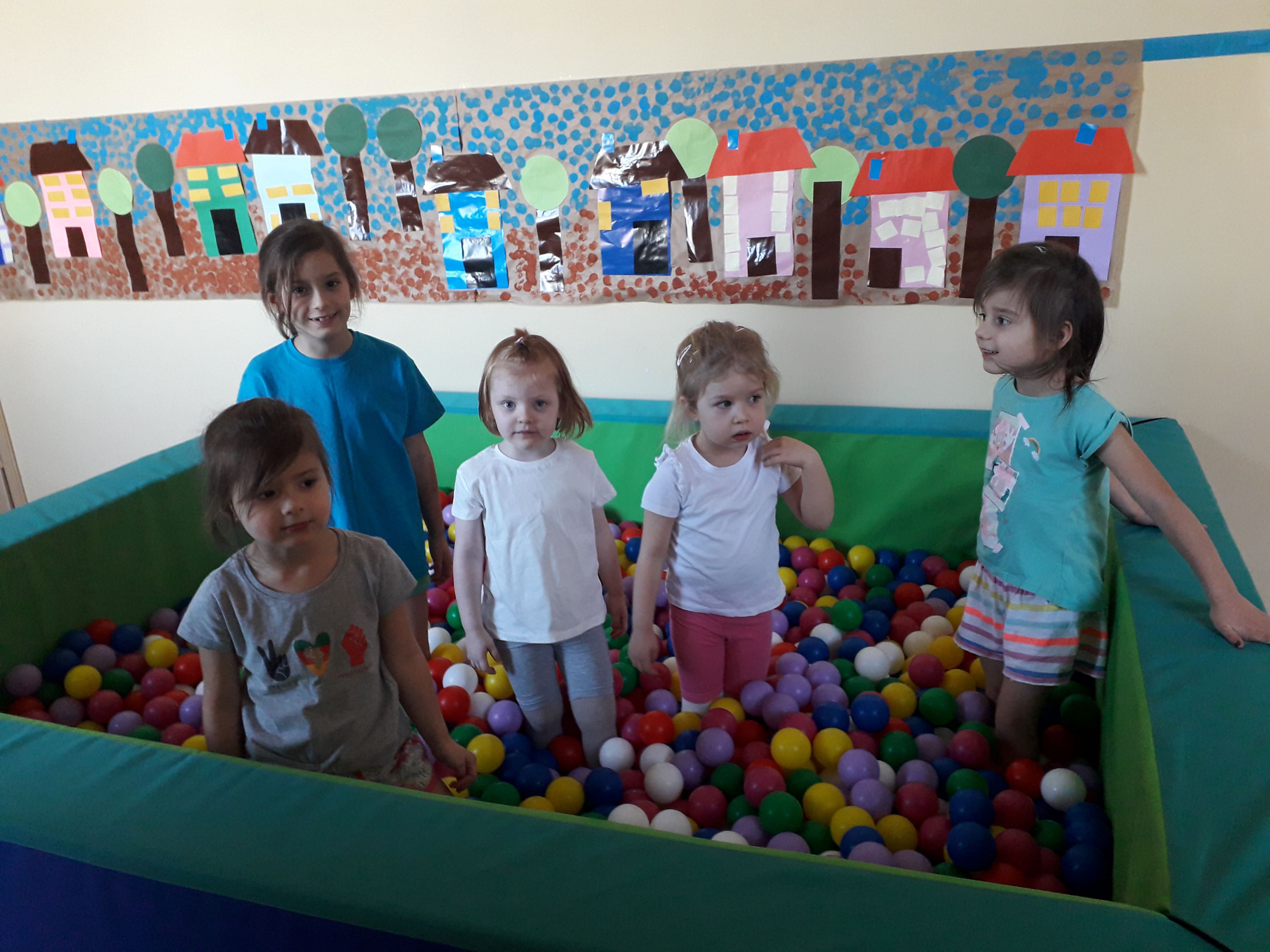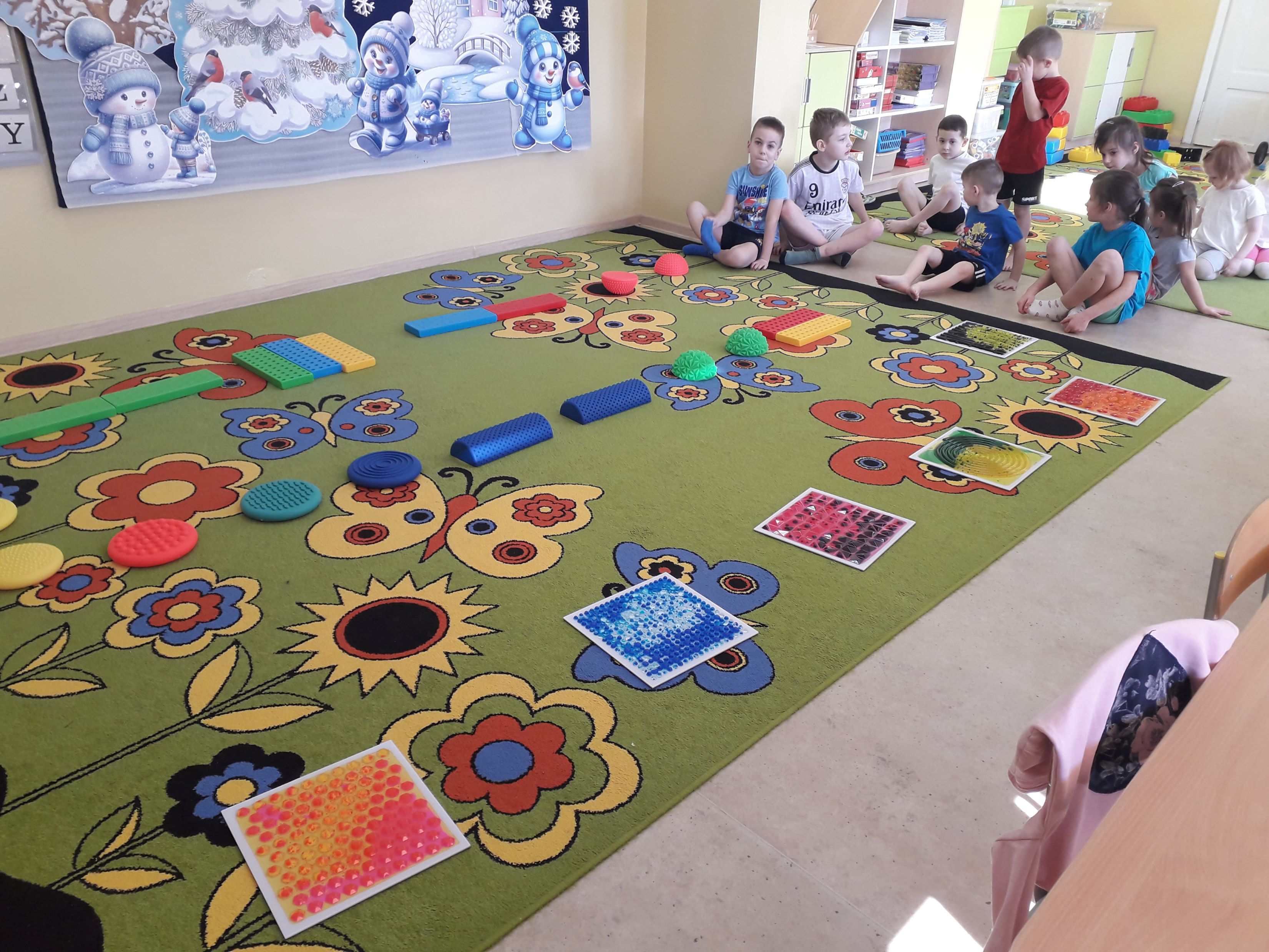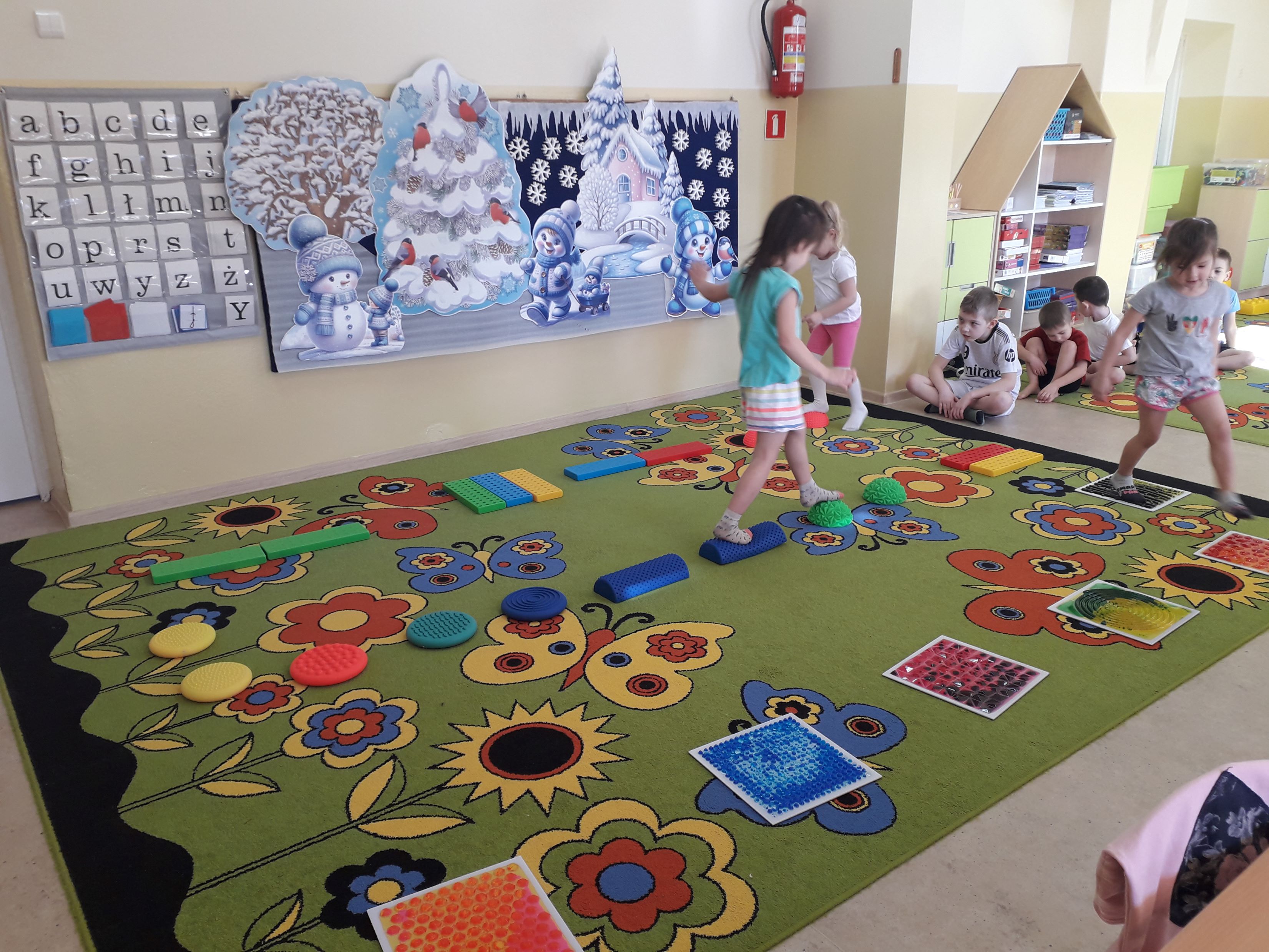 Podczas zajęć dzieci uczestniczą w różnorodnych zabawach i ćwiczeniach ruchowych, wykorzystując do tego typowe i nietypowe przybory gimnastyczne. Przedszkolaki uwielbiają ścieżki sensoryczne, które bardzo często sami budują z dostępnych przedmiotów sensorycznych.