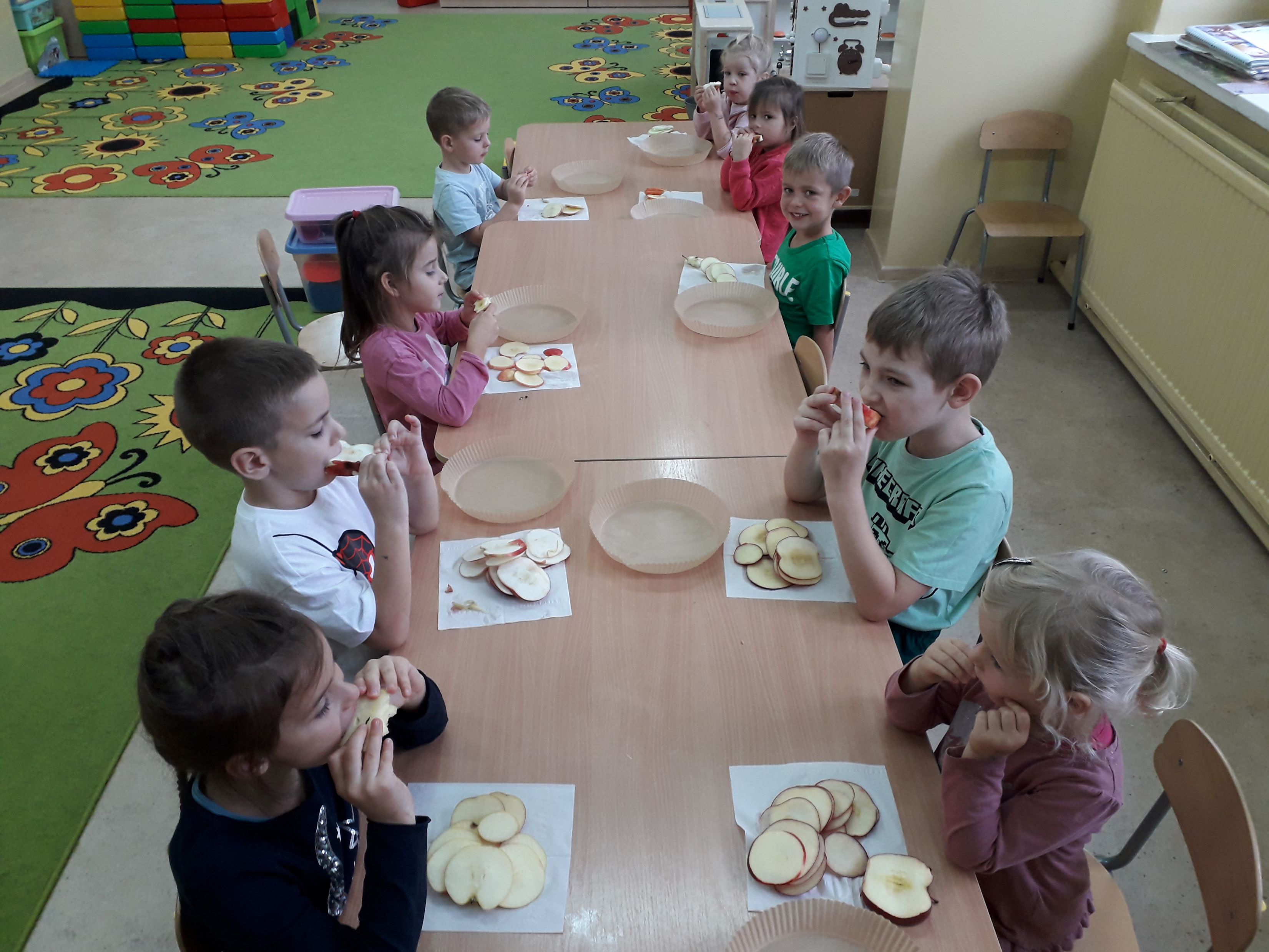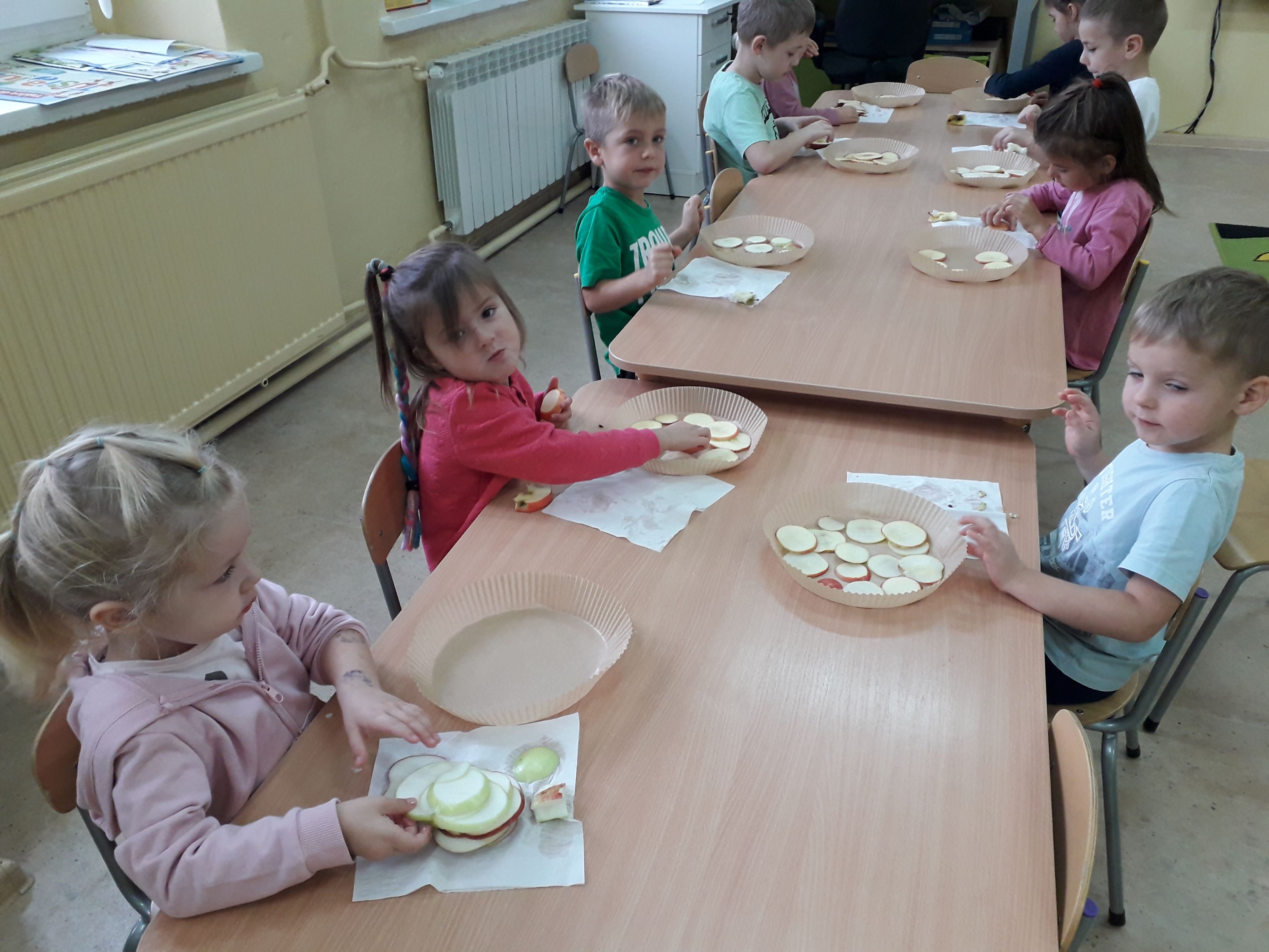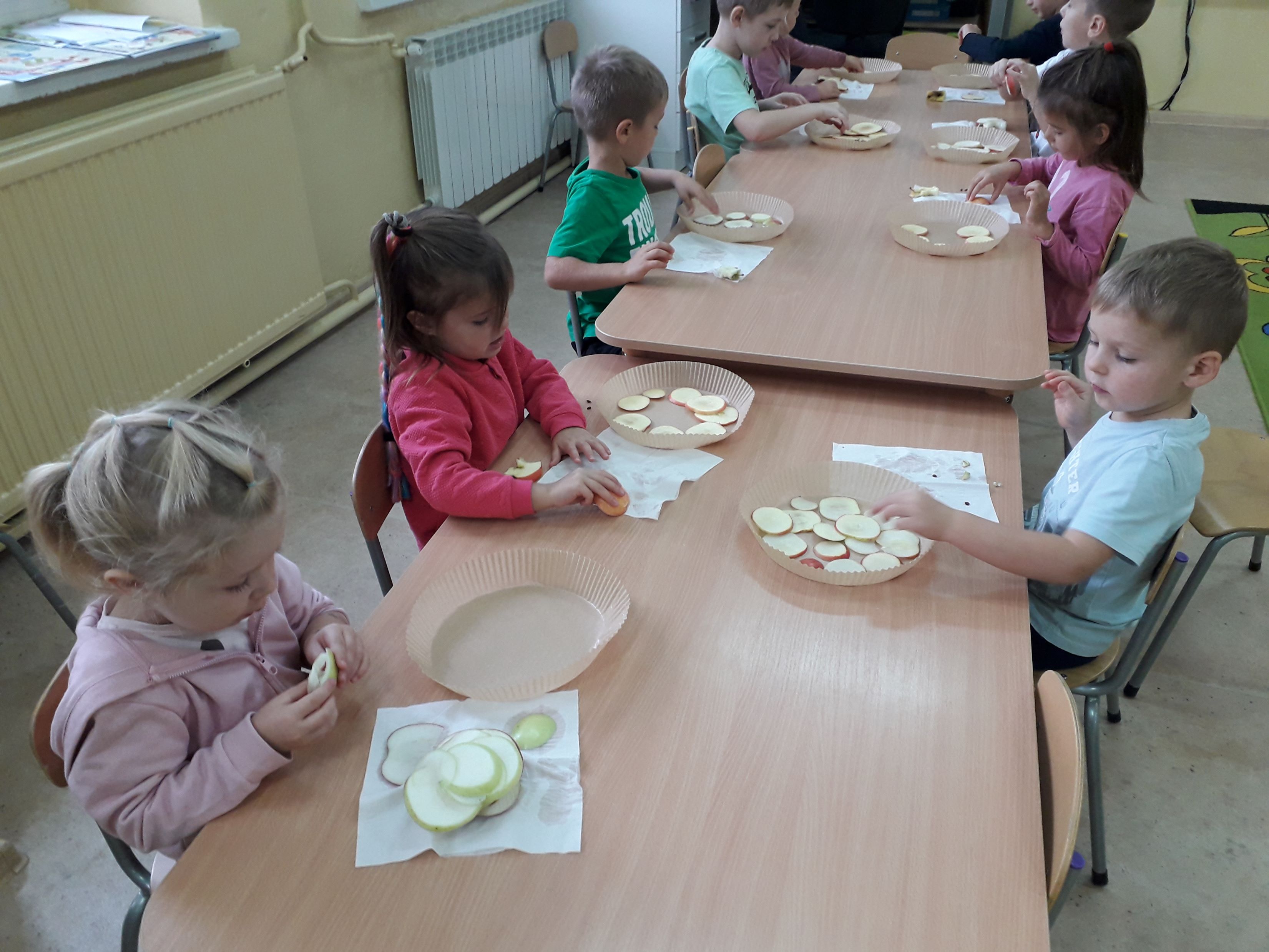 Przedszkolaki poznały również sposoby przechowywania i przetwarzania owoców na zimę. Podczas zajęć plastycznych samodzielnie wykonały susz jabłkowy.