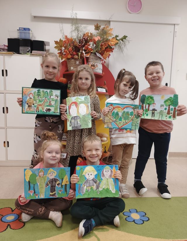 Podczas zajęć dzieci rozmawiały o tym, kim są strażnicy lasów i jak ważna jest ich praca. Przedszkolaki z zaciekawieniem słuchały opowieści o tym, jak strażacy walczą z ogniem, a leśnicy pilnują, by las był czysty, zdrowy i pełen zwierząt. Następnie z zapałem przystąpiły do tworzenia swoich portretów – na kartkach pojawiły się kolorowe hełmy, zielone mundury, drzewa i uśmiechnięte twarze naszych bohaterów.