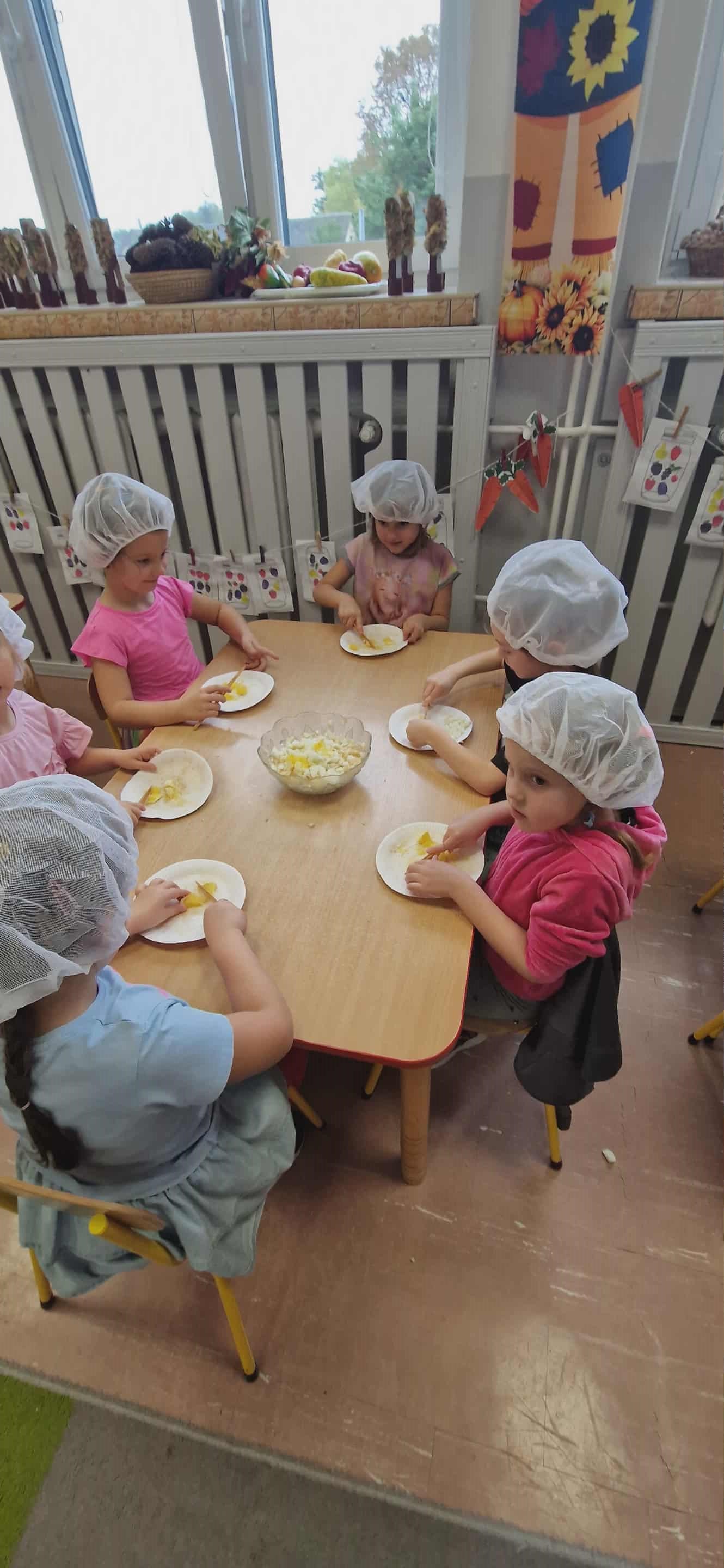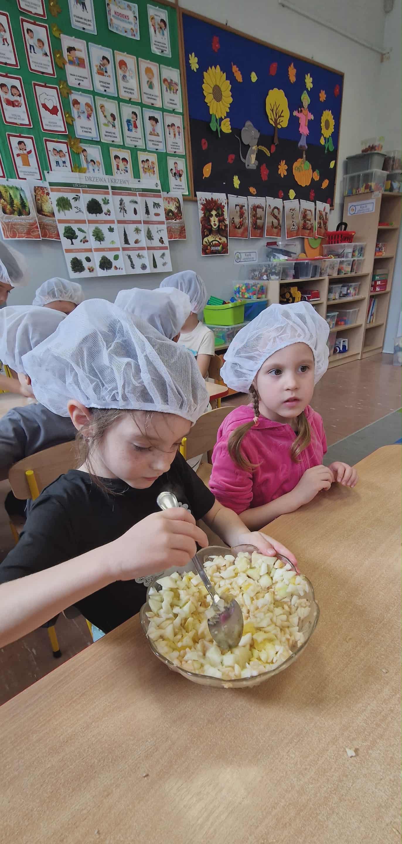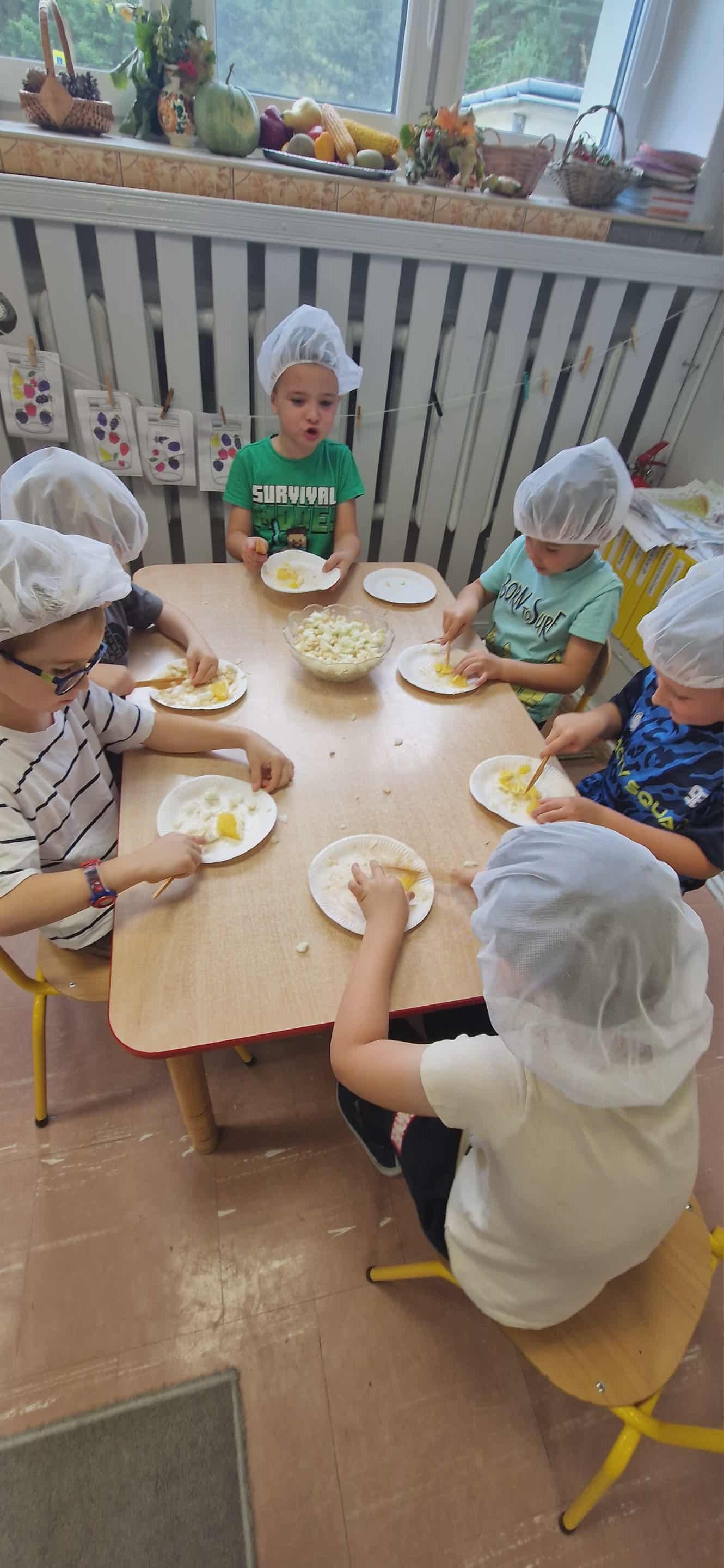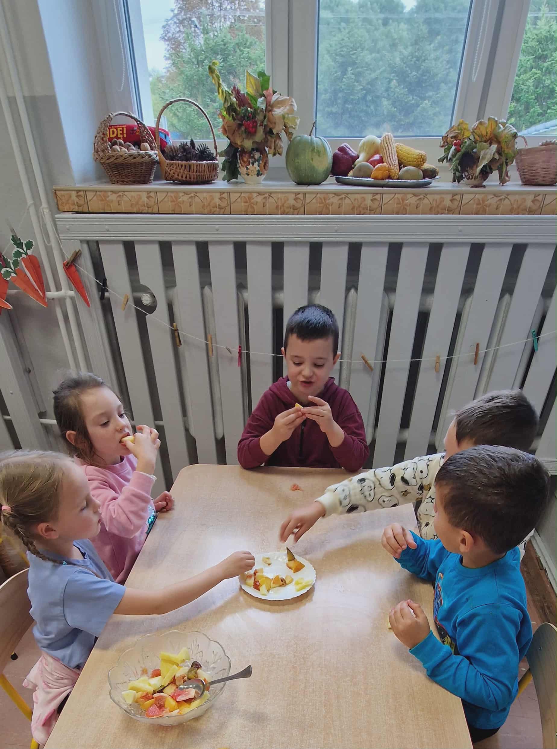 Na zakończenie tygodnia przedszkolaki z grupy 5-6 latków wspólnie przygotowały sałatkę owocową. Samodzielne krojenie (oczywiście pod czujnym okiem dorosłych) sprawiło wszystkim ogromną frajdę. Gotowa sałatka była nie tylko smaczna, ale i pełna witamin.