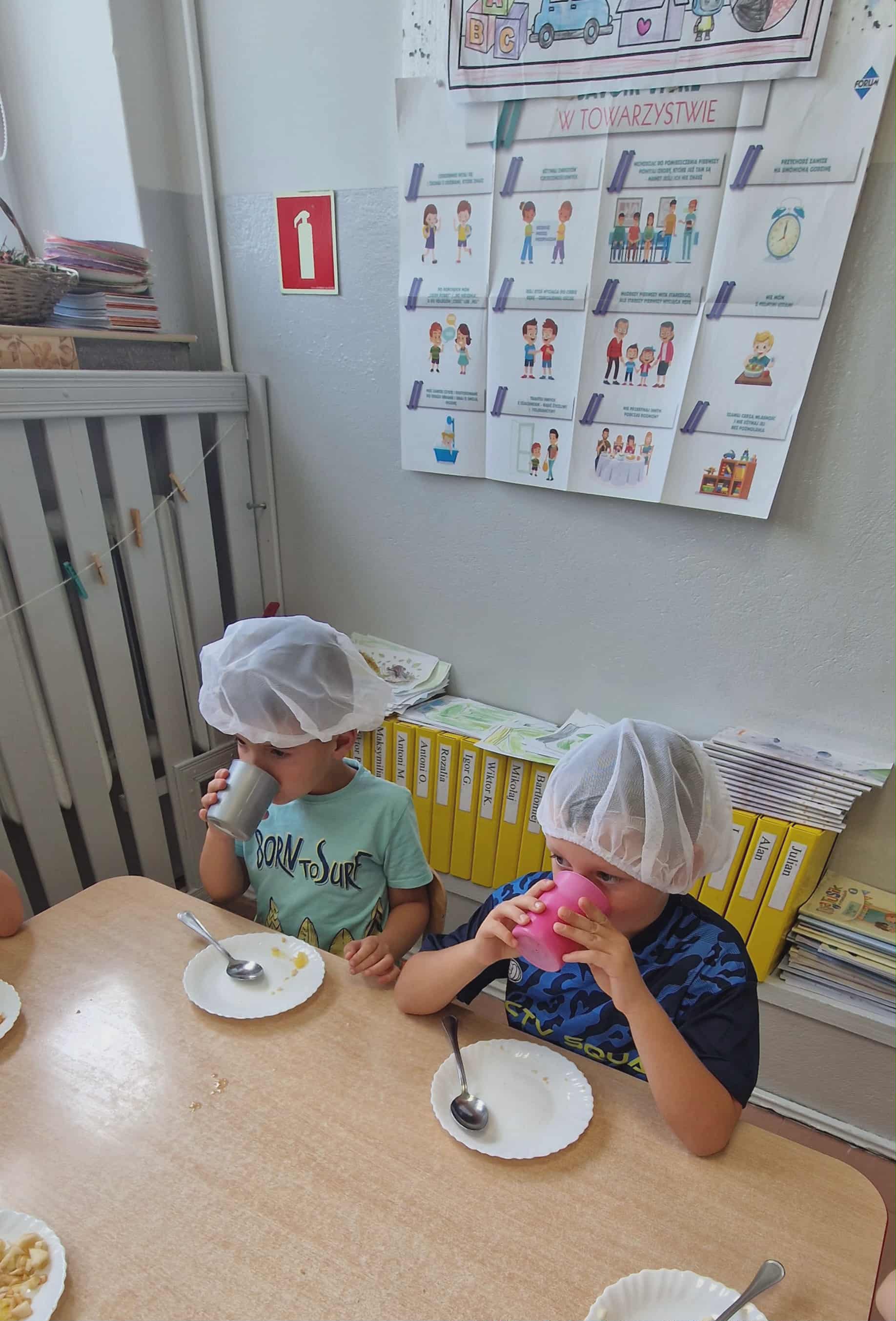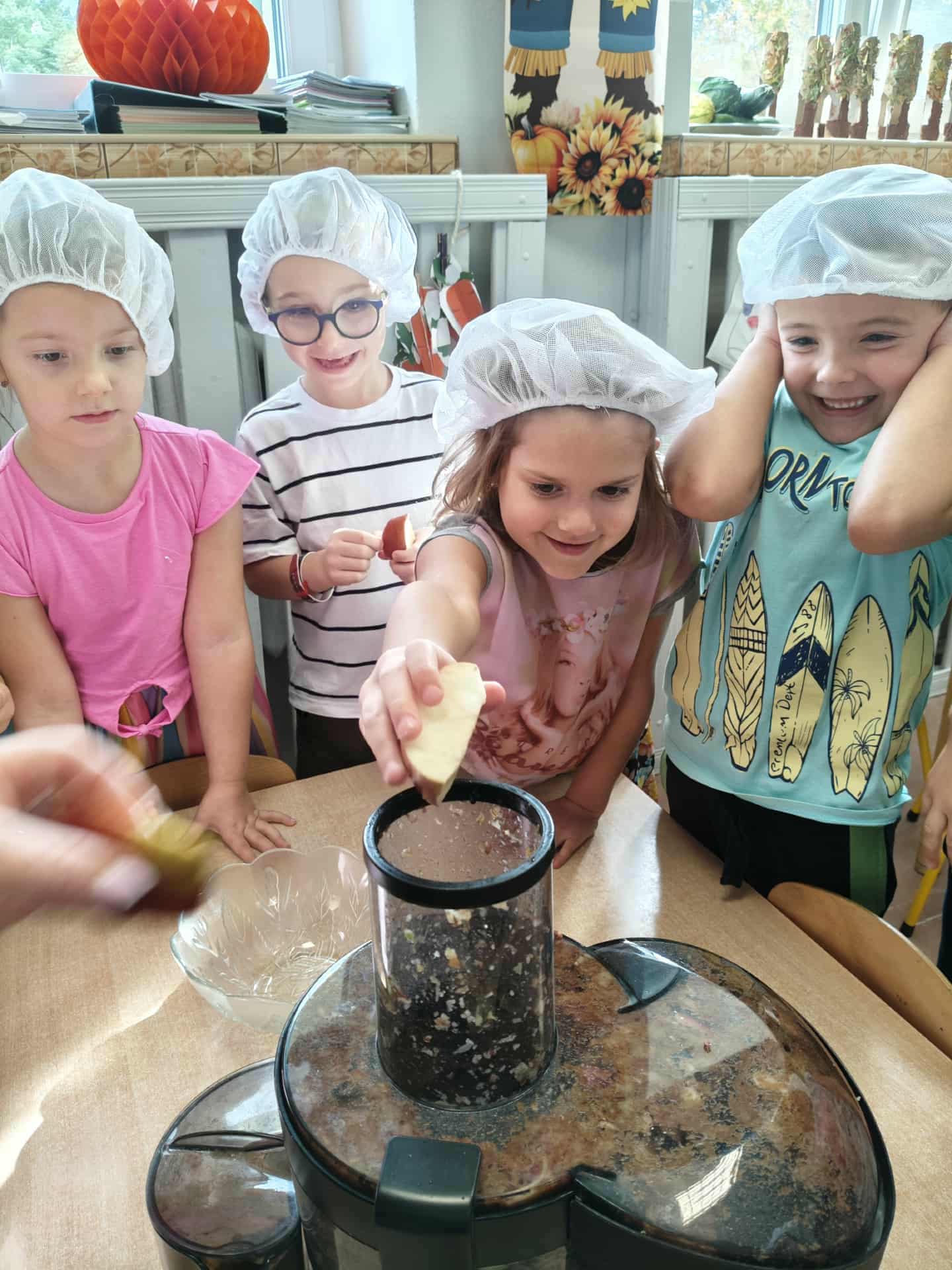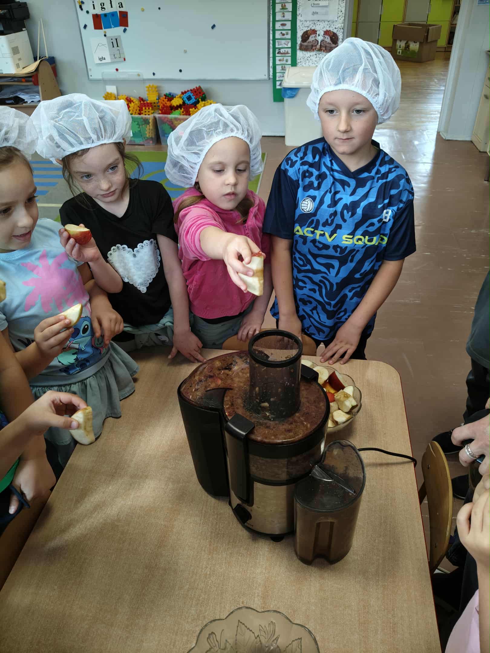 Jednym z najciekawszych momentów tygodnia była degustacja soków ze świeżych owoców. Dzieci obserwowały, jak działa sokowirówka, a potem z radością próbowały powstałych. Było zdrowo, smacznie i pachnąco.
