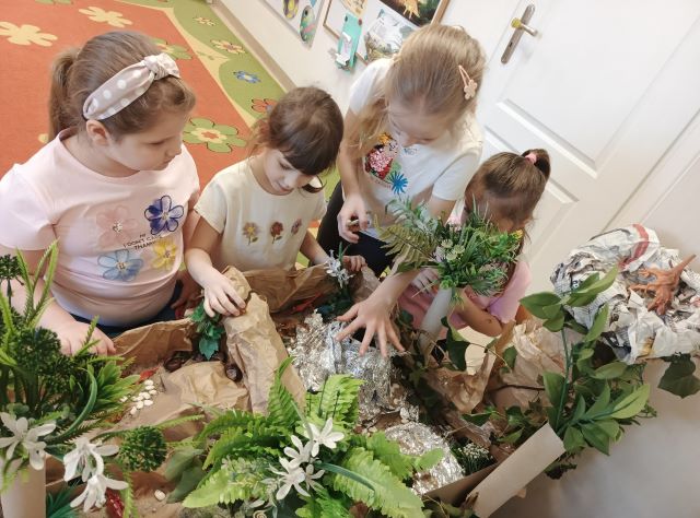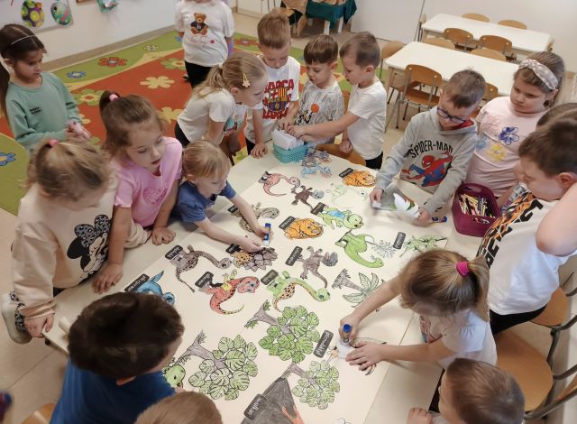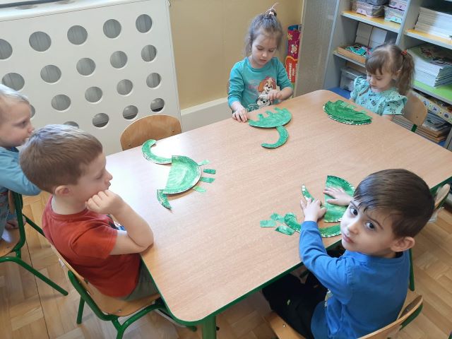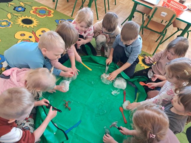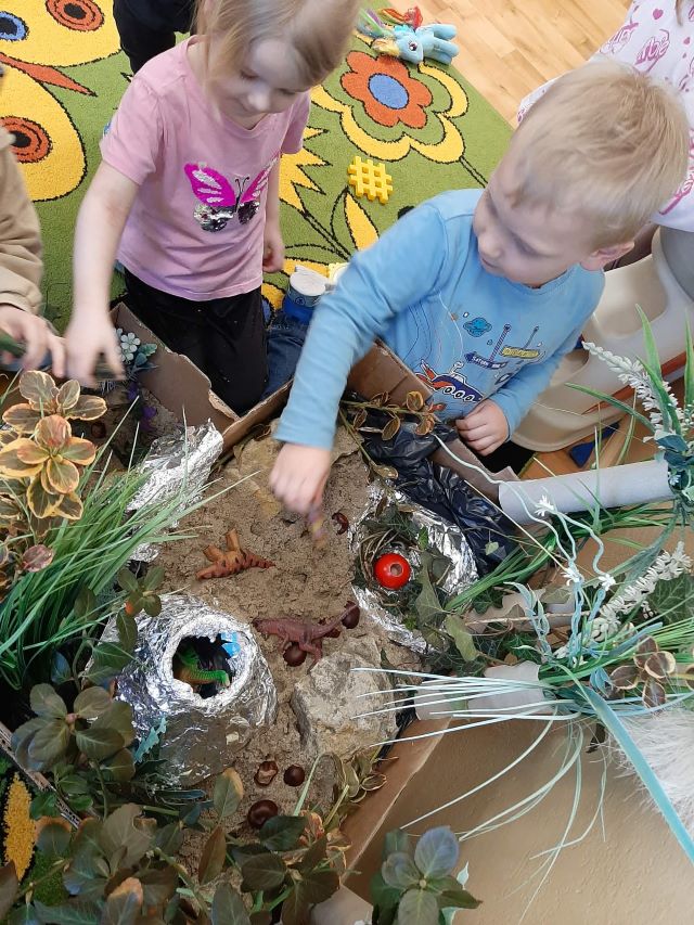 Nie zabrakło również wielu kreatywnych aktywności. Przedszkolaki wykonywały prace plastyczne przedstawiające dinozaury, tworzyły je z różnych materiałów, a także uczestniczyły w zabawach ruchowych i muzycznych inspirowanych światem prehistorycznym. Dużo radości sprawiło dzieciom również „poszukiwanie skamieniałości” oraz zabawy tematyczne.