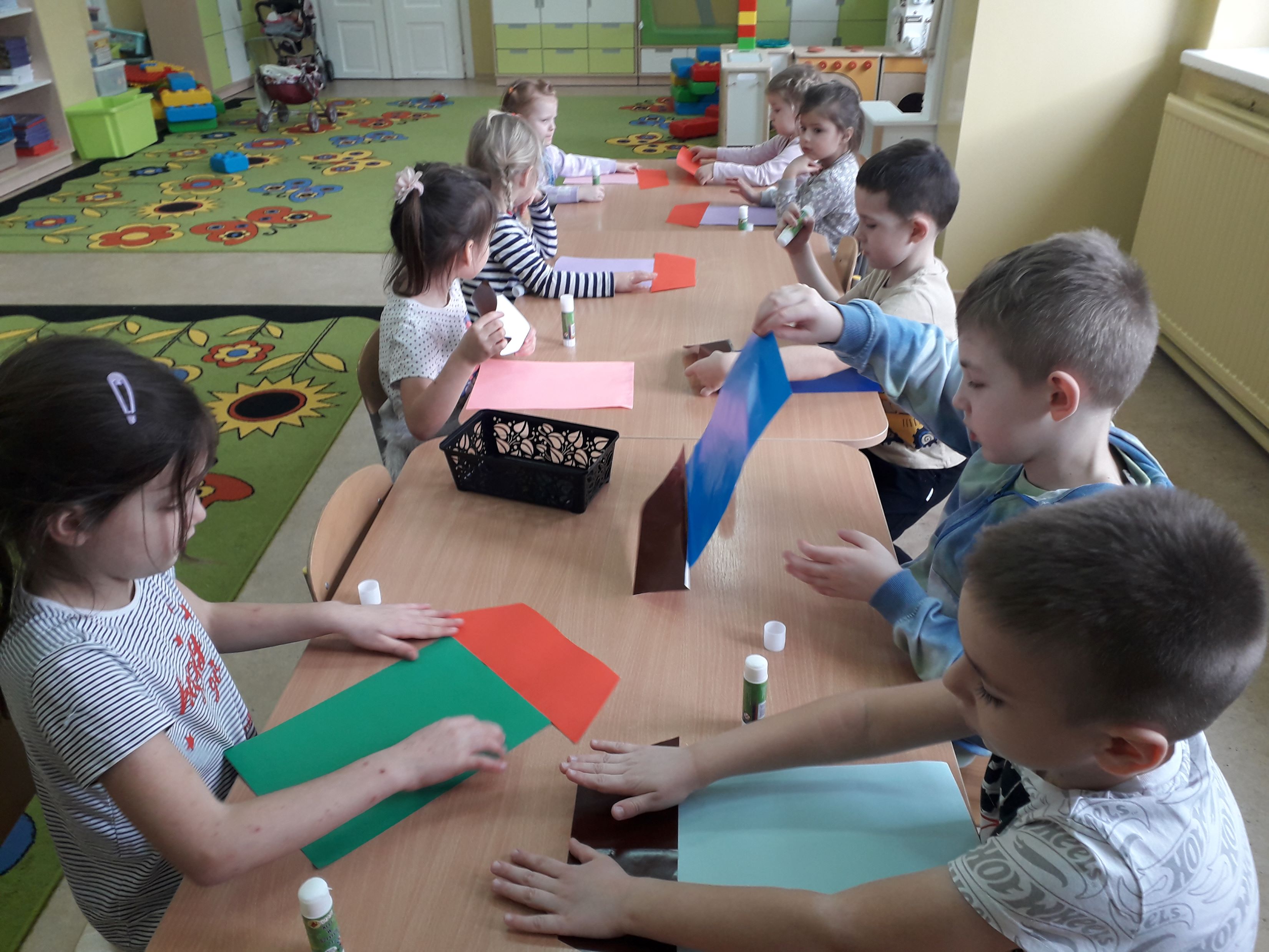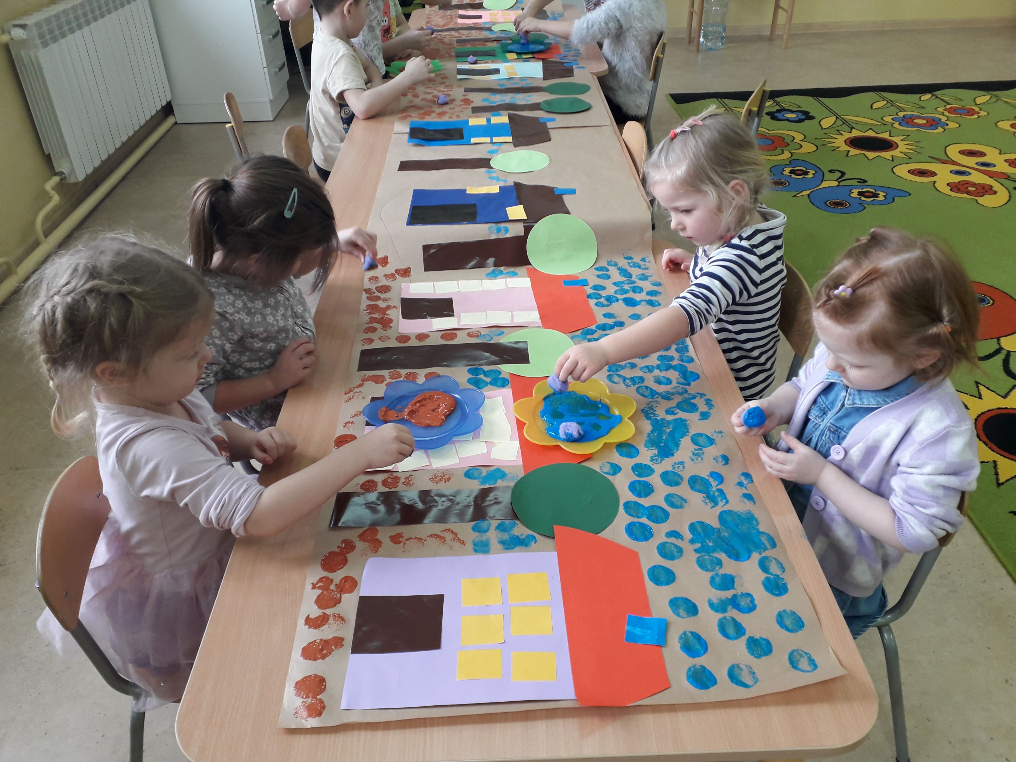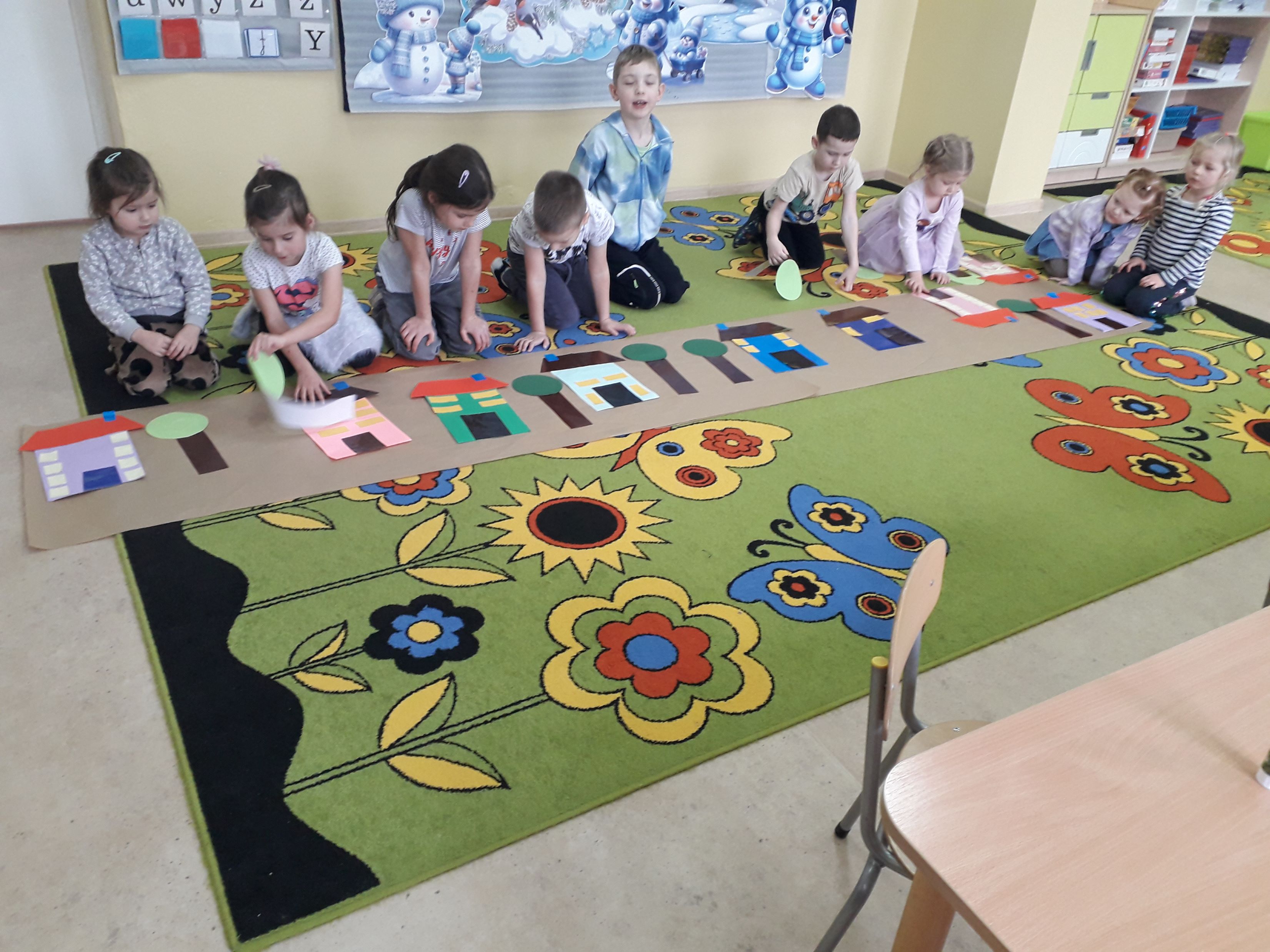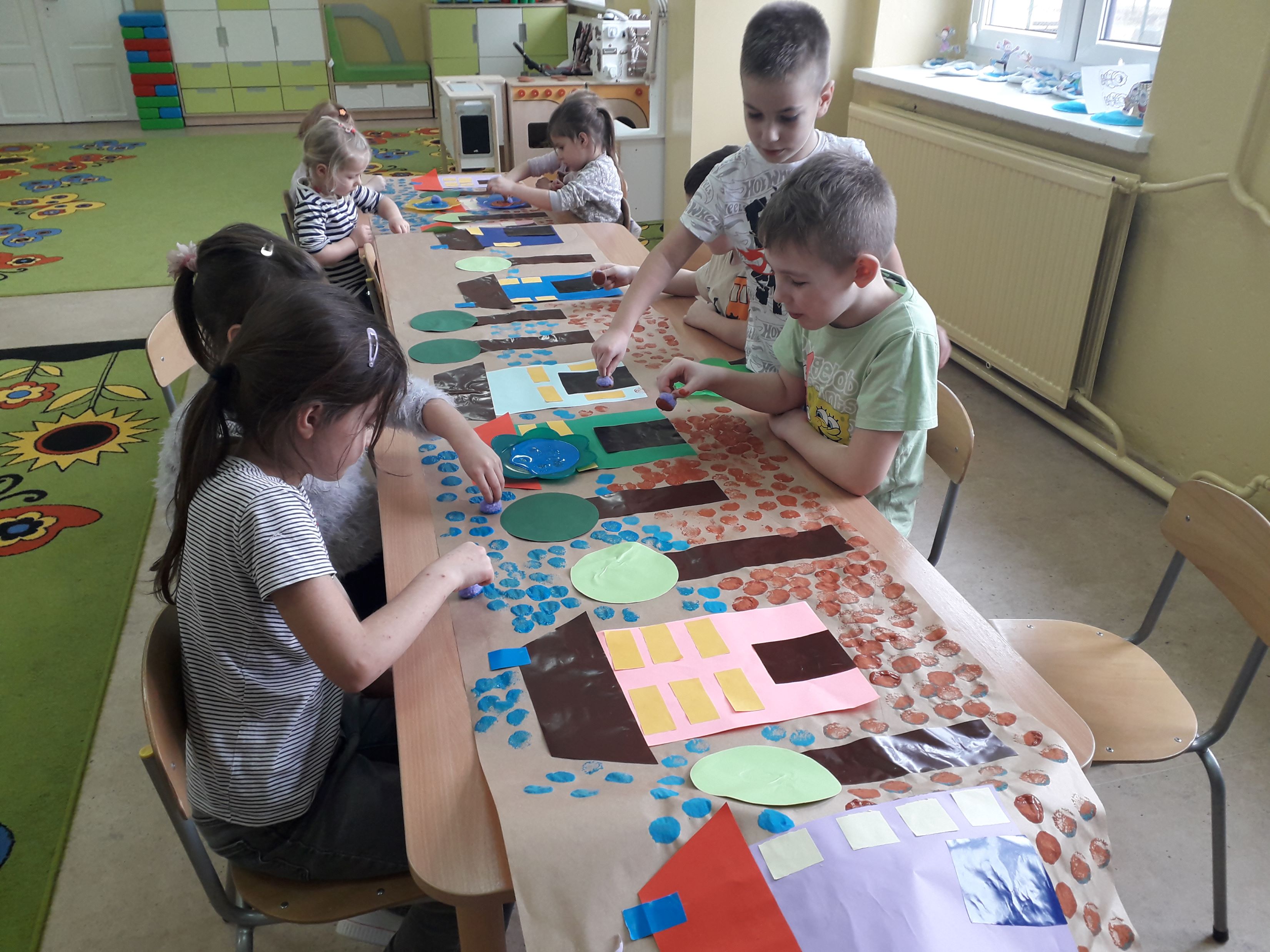 Podczas zajęć plastycznych przedszkolaki zaprojektowały i wykonały wioskę geometryczną oraz geometryczne drzewa z wykorzystaniem figur geometrycznych. Działania te rozwijały wyobraźnię, kreatywność oraz sprawność manualną a rezultaty można podziwiać w Przedszkolnej Galerii.