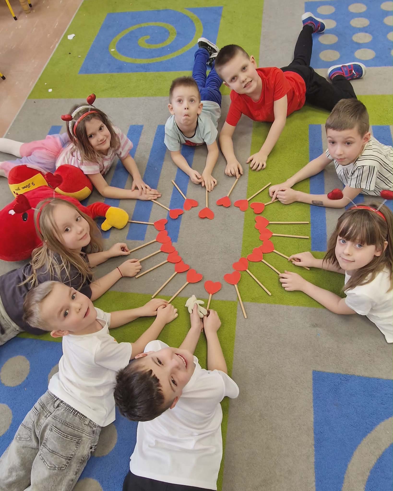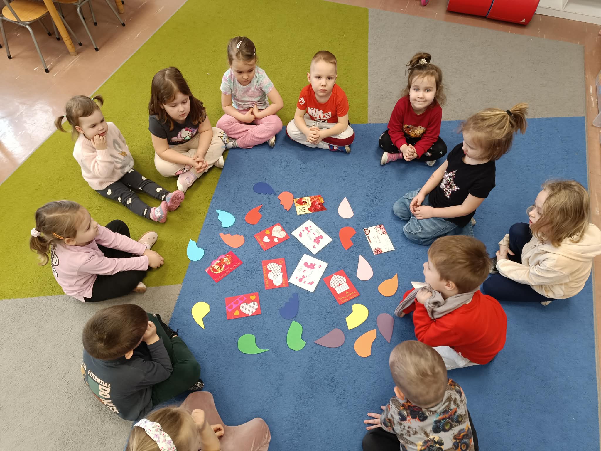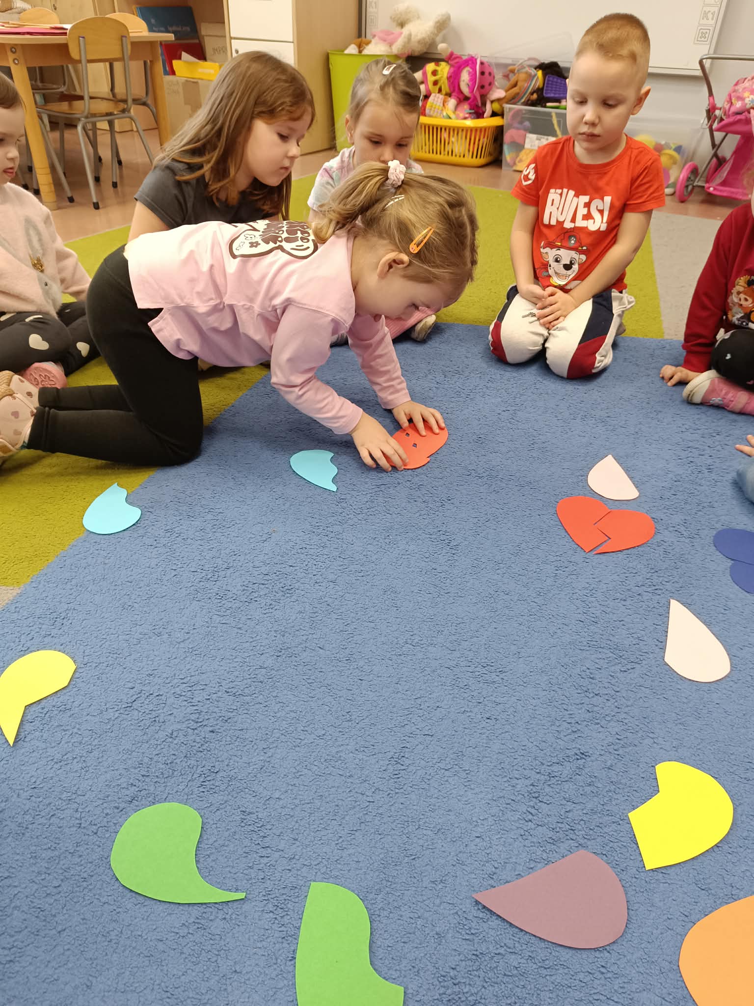 Były rozmowy o przyjaźni i o tym, jak możemy okazywać sympatię kolegom i koleżankom oraz dlaczego warto mówić sobie miłe słowa. Dzieci brały udział w zabawach zespołowych, które wymagały współdziałania. Szukały ukrytych serc i dopasowywały połówki serc.