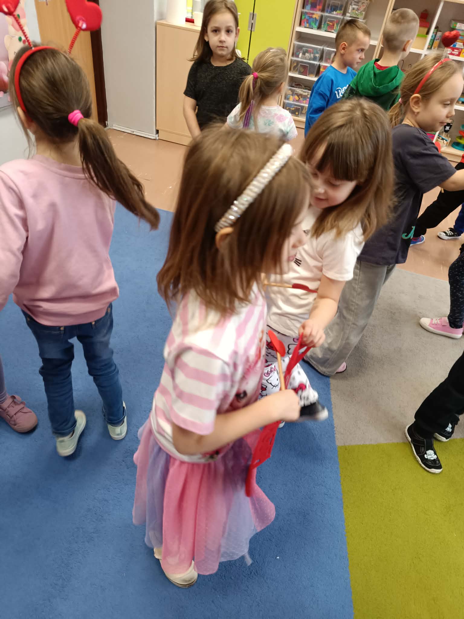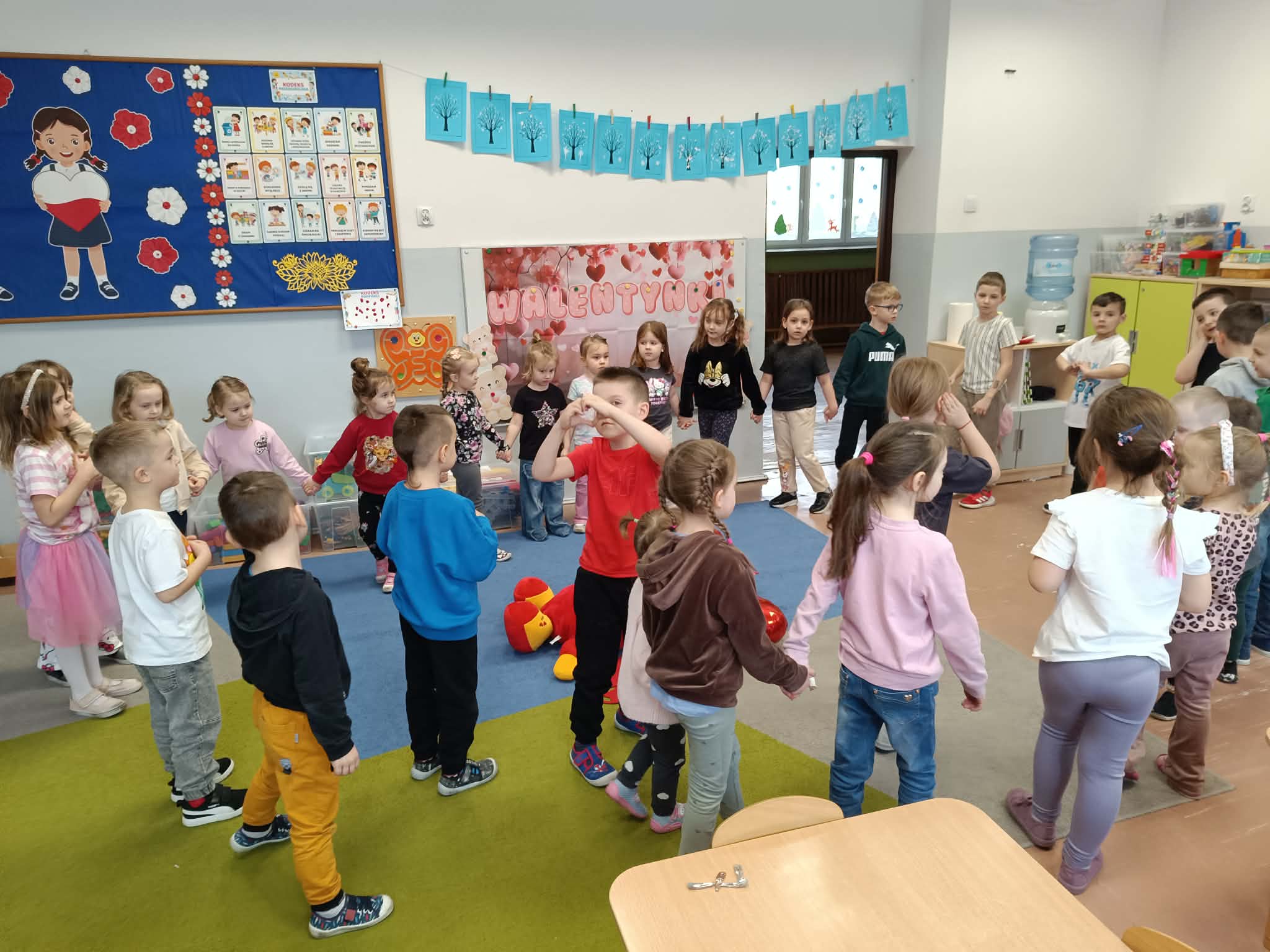 Dużo energii i śmiechu przyniosła walentynkowa gimnastyka. Ćwiczenia ruchowe w rytmie wesołej muzyki i zabawy taneczne w parach pozwoliły dzieciom aktywnie spędzić czas.