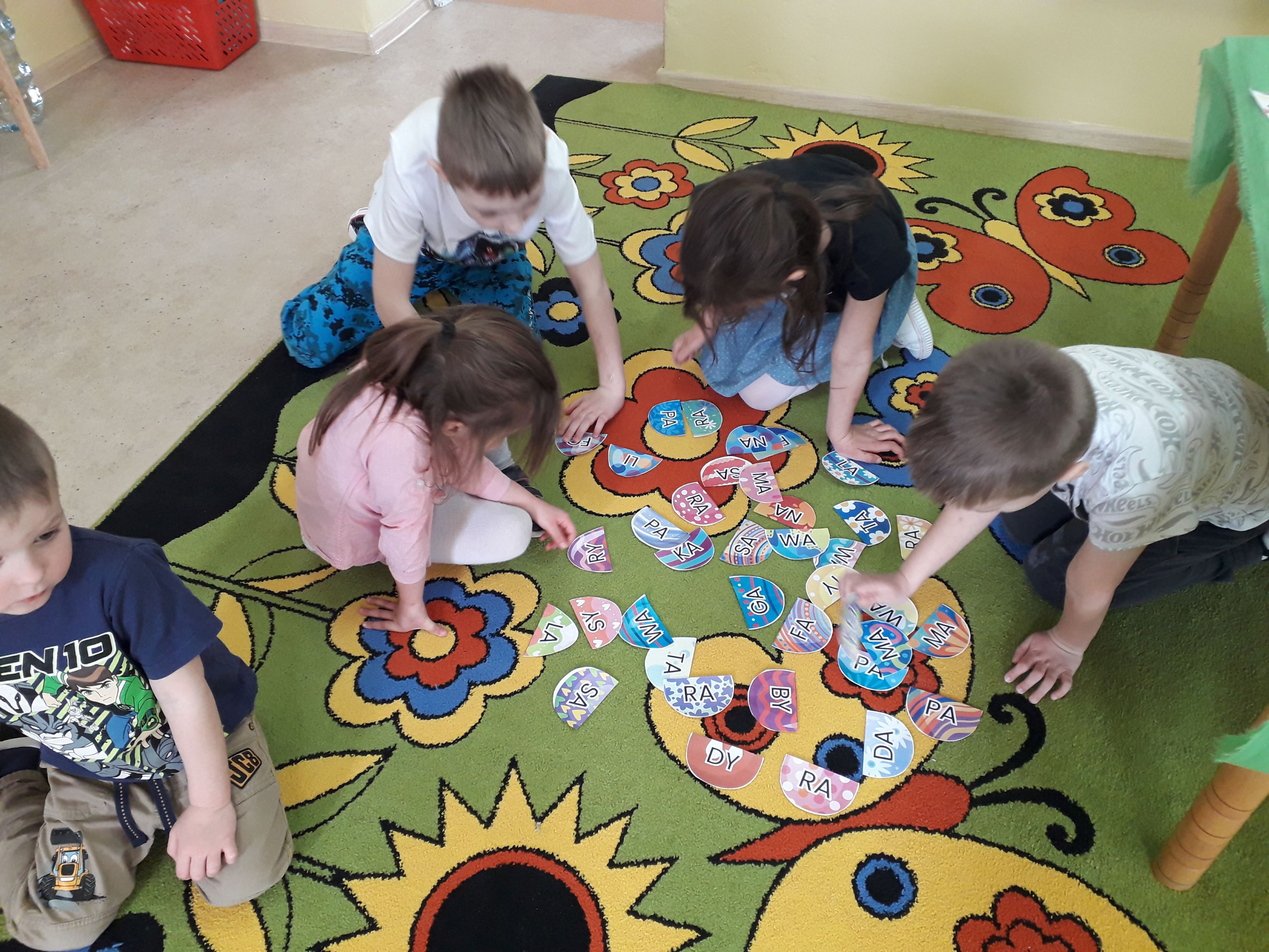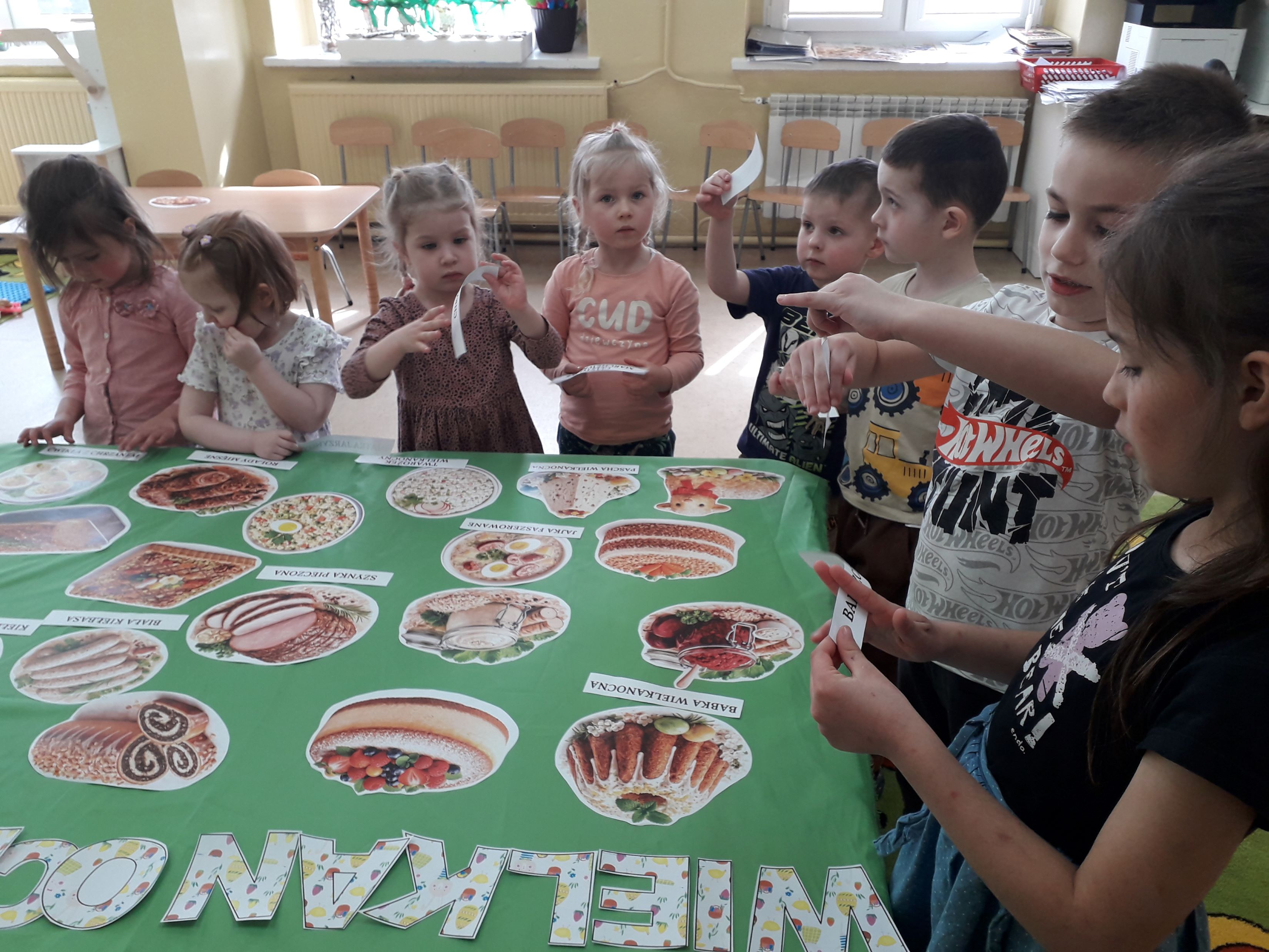 Wśród proponowanych aktywności były zadania matematyczne z sylwetami pisanek i jajeczek wielkanocnych, układanie pisankowych wyrazów z sylab oraz przygotowanie stołu z sylwetami potraw wielkanocnych.